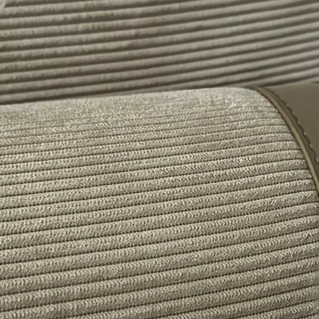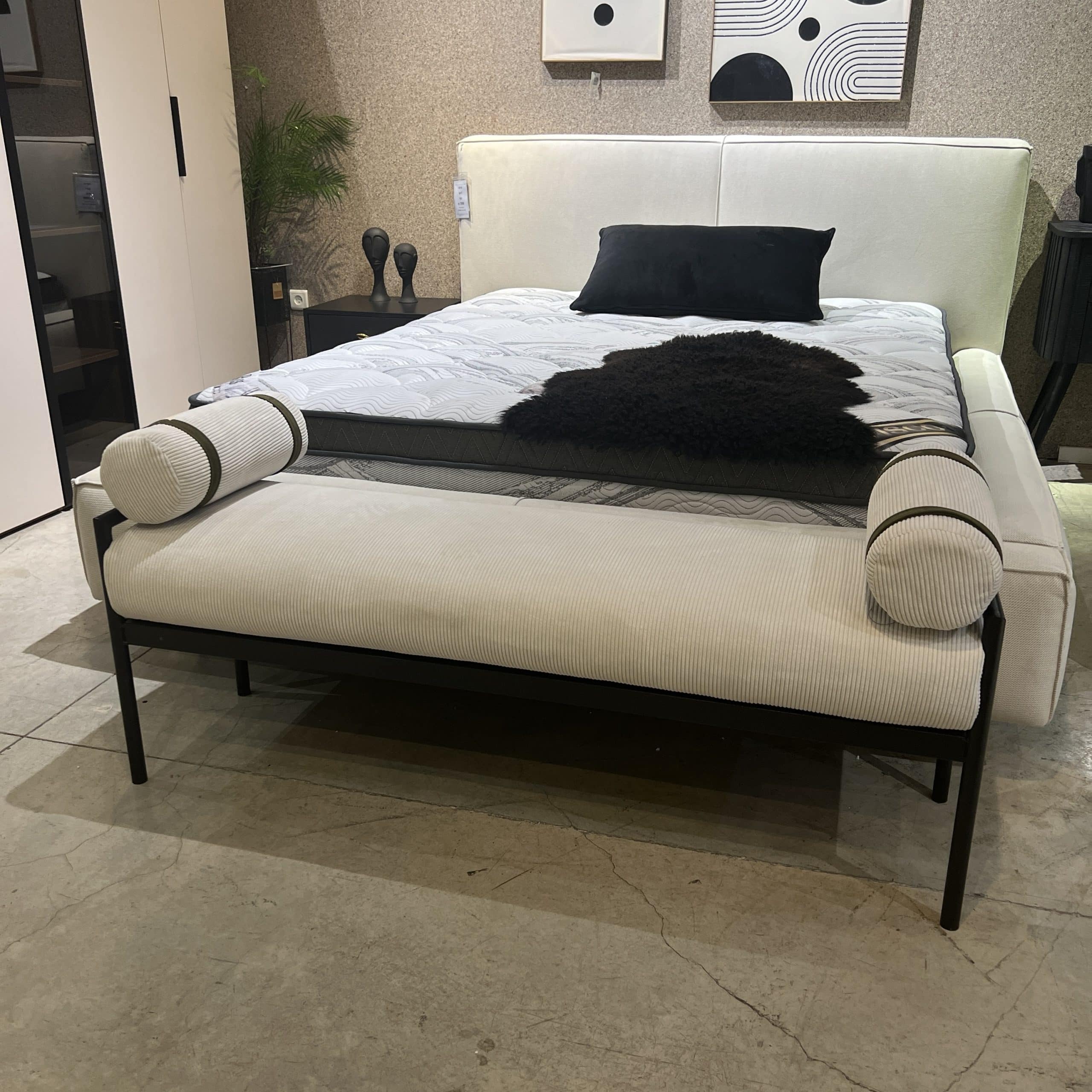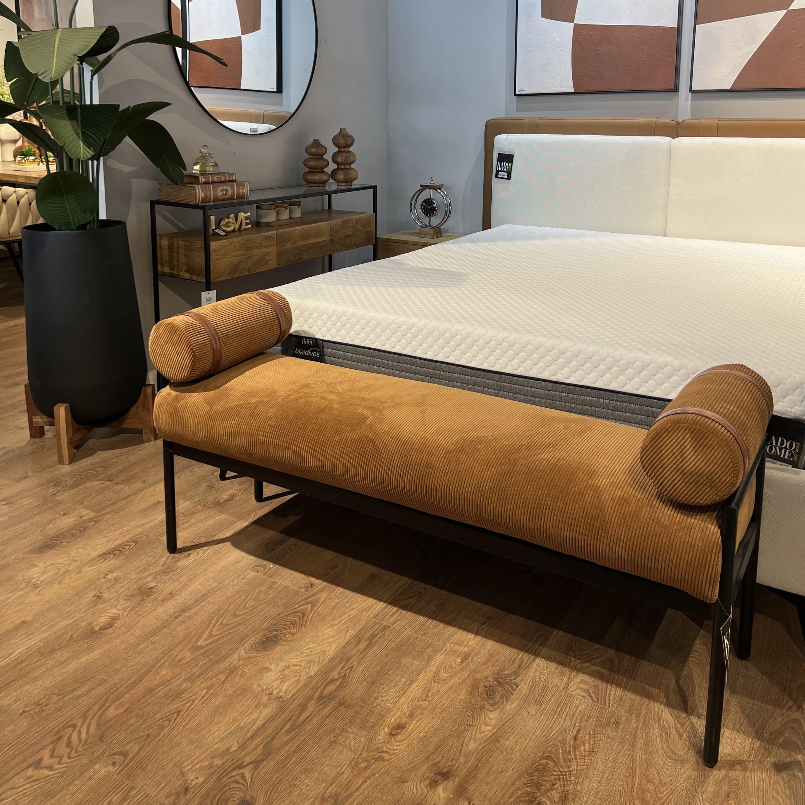 ספסל והדום ישיבה מלבני מודרני ואופנתי המרופד בבד קורדרוי ורגלי ברזל מינימליסטית.