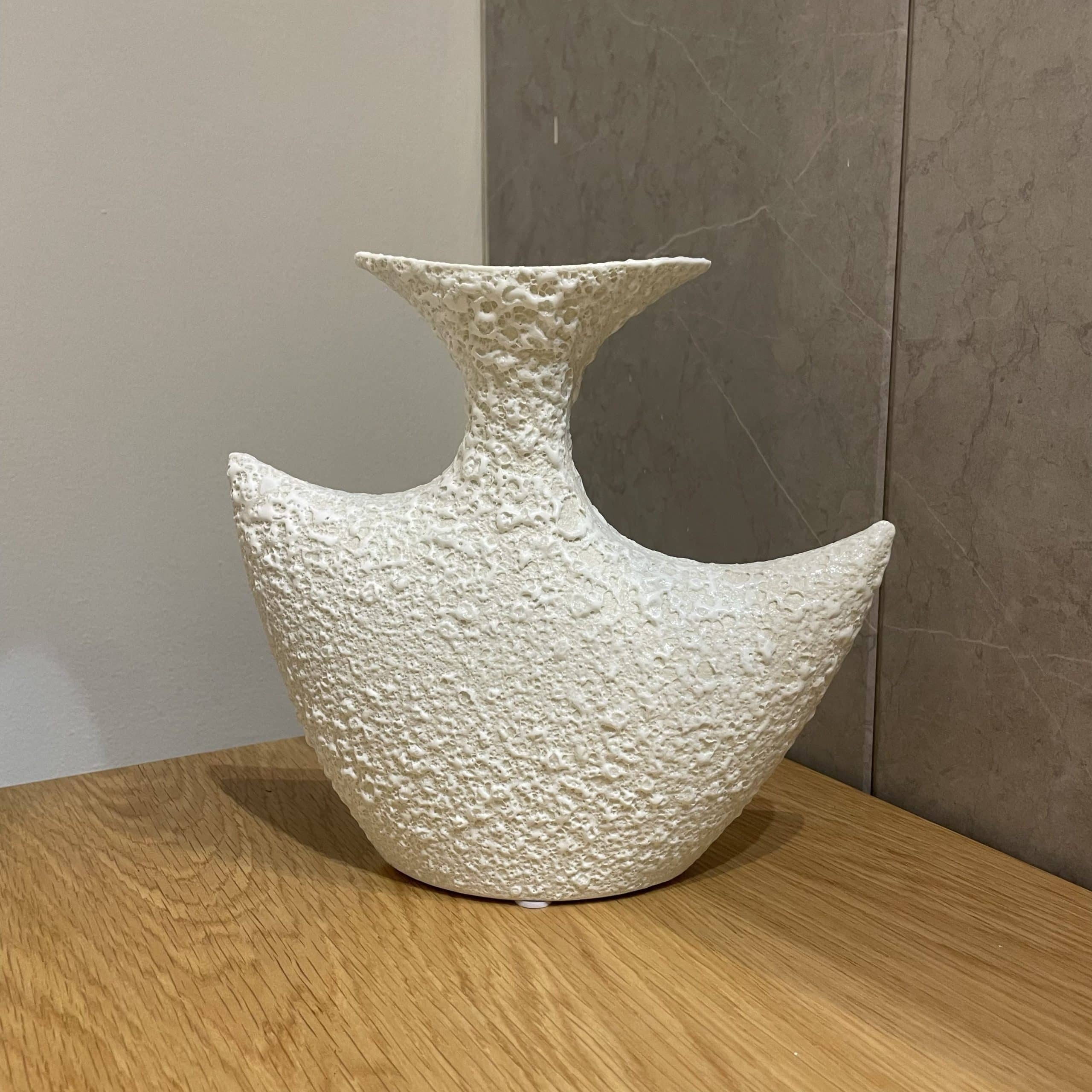 כד קרמיקה לבן טקסטורה בועות סירה דגם איקו בטקסטורה עדינה המעניקה לו מראה אורגני וחושי , עיצובו מזכיר צורת סירה בקווים רכים וזורמים המתאימים למגוון סגנונות עיצוב , מתאים לשילוב כפריט עיצוב עצמאי או כאגרטל לפרחים