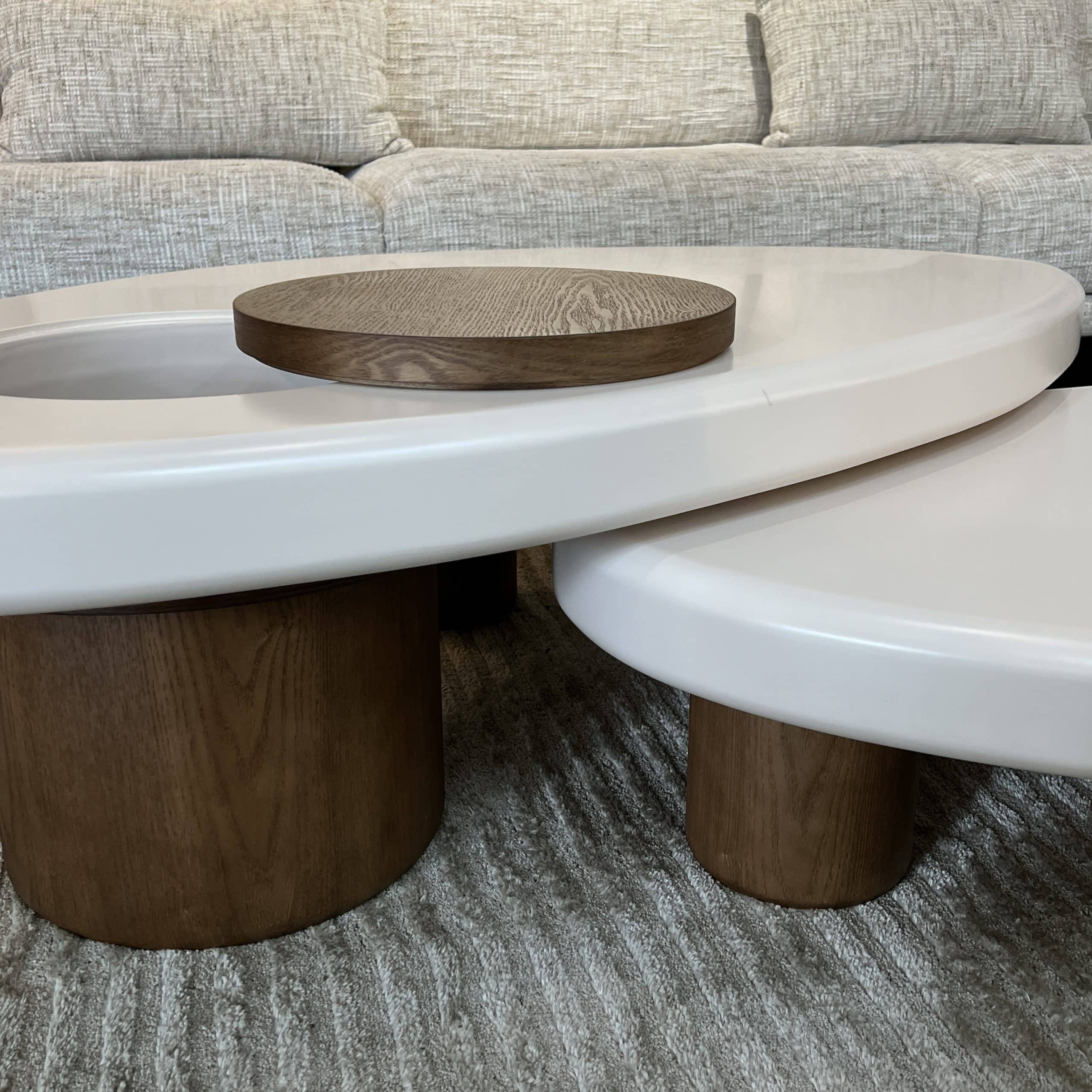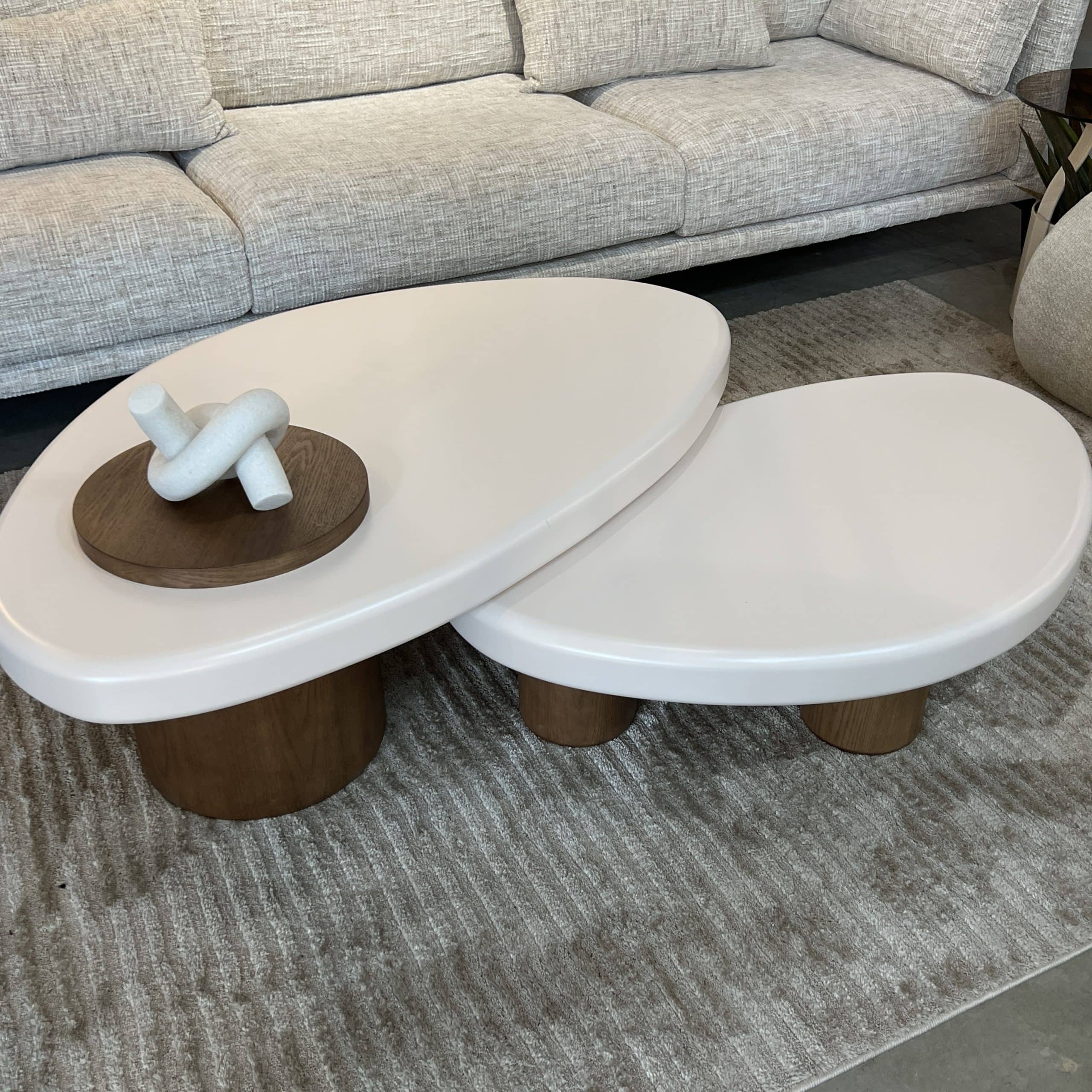 סט שולחנות סלון בעיצוב יוקרתי ונקי, המתאפיינים בקווים עגולים מודרניים. פלטה בגוון שמנת אמורפי ורגלי עץ אגוז המעניקות מראה חם ומזמין לחלל. מושלם להשלמת מראה הסלון ומשתלב בקלות במגוון רחב של סגנונות עיצוב