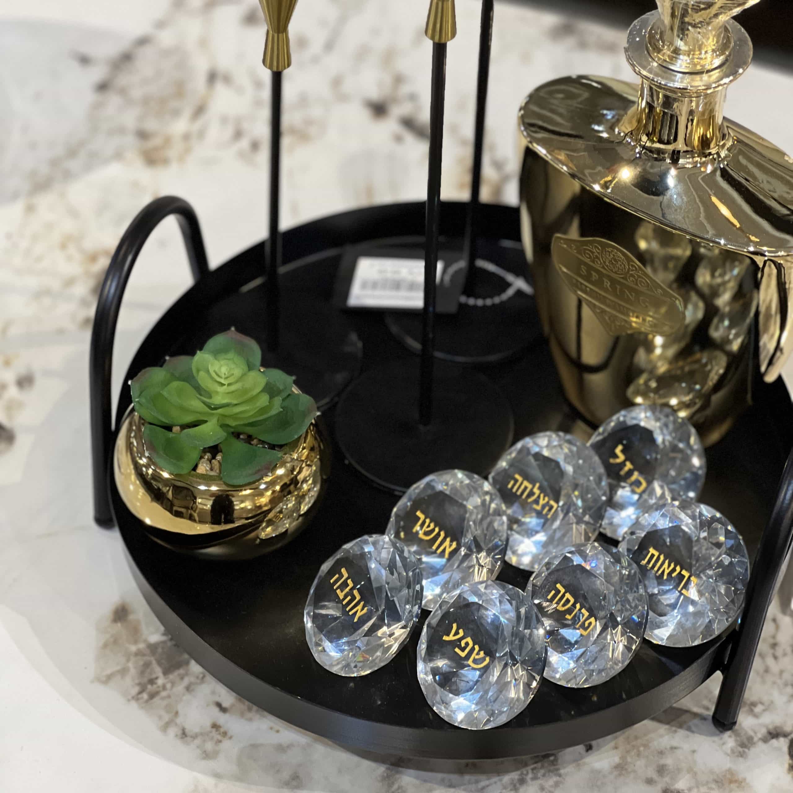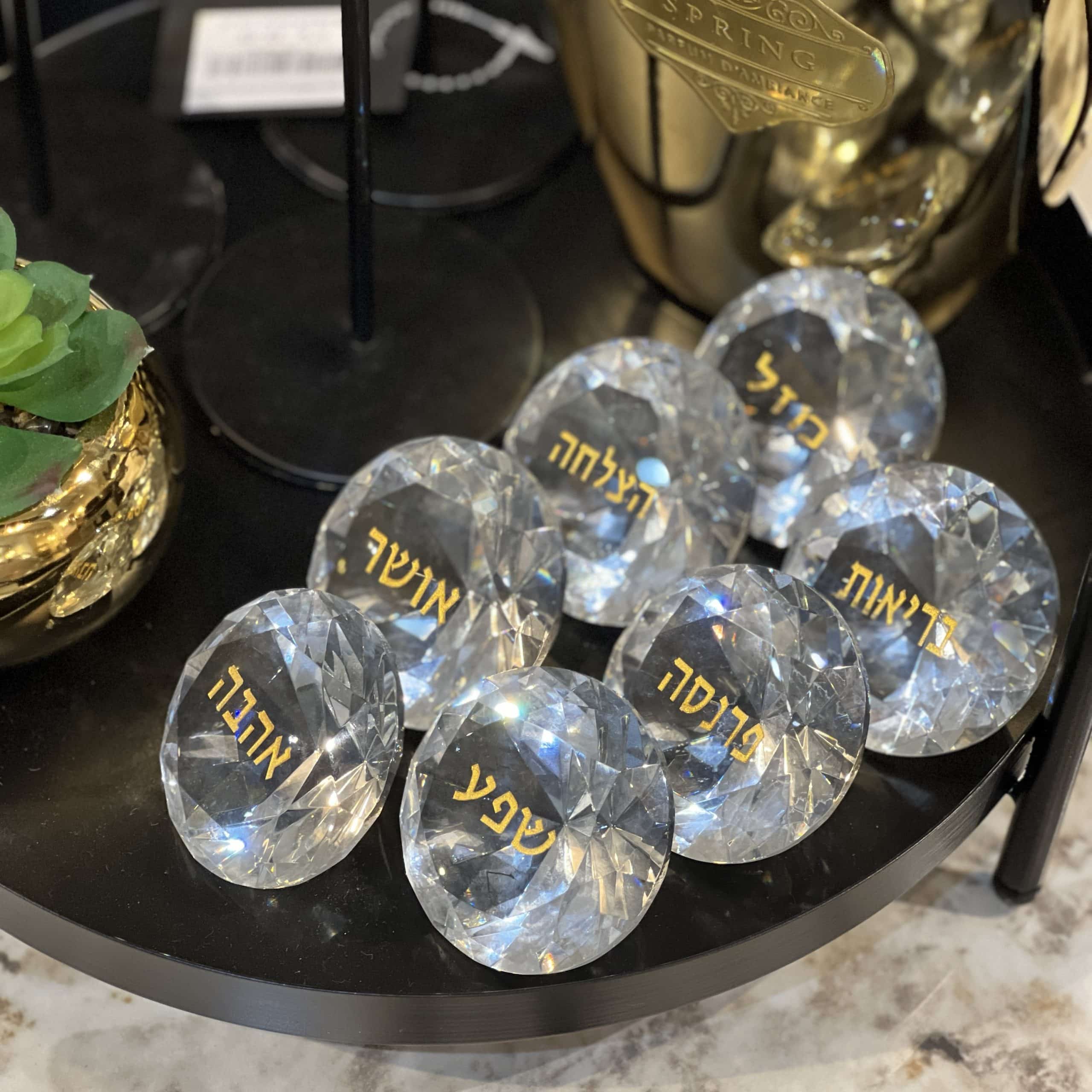 אבני זכוכית קריסטל ייחודיות בצורת יהלום מרהיבות עם כיתוב ברכות בצבע זהב: אושר, מזל, אהבה, בריאות, פרנסה, הצלחה, שפע.